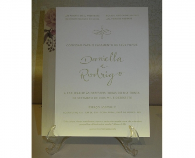 Ref: C28Papel/Gramatura (convite): Papel Markatto 250gCores: 1x0 corTamanho Fechado: 32,5x22cmAcabamento(s) padrão(ões):* Relevo Americano* Relevo Seco no Monograma externo* Envelope Fechado* Moldura Interna em Relevo* Papel Vegetal com impressão envolvendo o convite