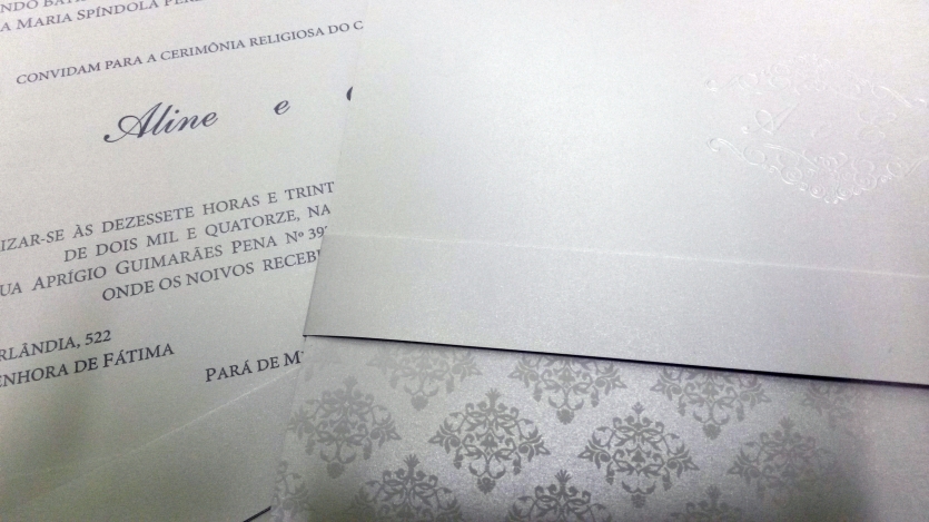 Ref: C20Papel/Gramatura (convite): Papel Aspen 240gCores: 1x0 corTamanho Fechado: 28,5x20,5cmAcabamento(s) padrão(ões):* Relevo Americano* Relevo Seco no Monograma externo* Colagem Interna* Moldura em Relevo* Faixa Externa envolvendo o convite